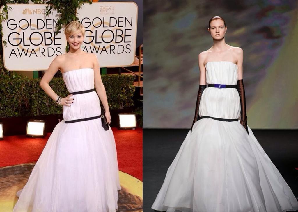 Jennifer Lawrence in Dior Couture Fall 2013: She is the Couture House’s spokesperson. Tonight she wore a strapless ivory silk organza gown that is pleated throughout then “cinched” at the waist and below the hips with belts. The hand-made gown is designed by Raf Simons and is from the Dior Haute Couture Fall 2013 collection, which is approximately $50-$75,000.