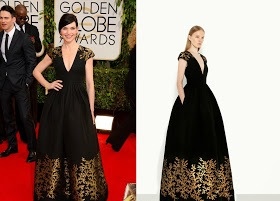 Julianna Margulies in Andrew Gn Resort 2014: Margulies wore a black gown with gold leaf-like trim detail from Andrew Gn Resort 2014. the gown features a full pleated skirt, side in-seam pockets, plunging neckline and drop shoulders.