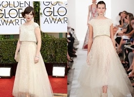 Zooey Deschanel in Oscar de la Renta Spring 2014: Zooey is wearing a golden-hued gown from Oscar de la Renta Spring 2014 collection. The gown features a high-lo tulle skirt and cropped sequined drop-shoulder outer top. This gown comes from an Oscar de la Renta collection that was “co-designed” by John Galliano…